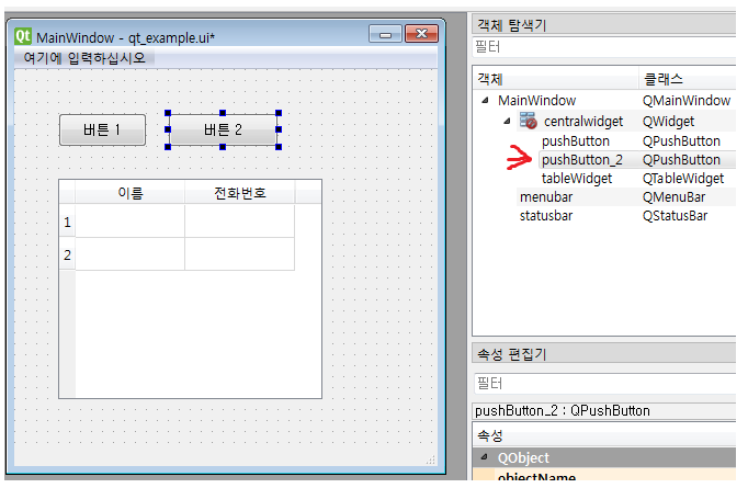 위 그림에서 테이블도 한개 있는데 해당 테이블 객체의 이름은 tableWidget 라는 것을 알 수 있다.