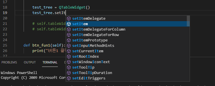 이제 self.tableWidget 객체의 클래스가 QTableWidget 이라는 사실을 VSCODE가 알기 때문에