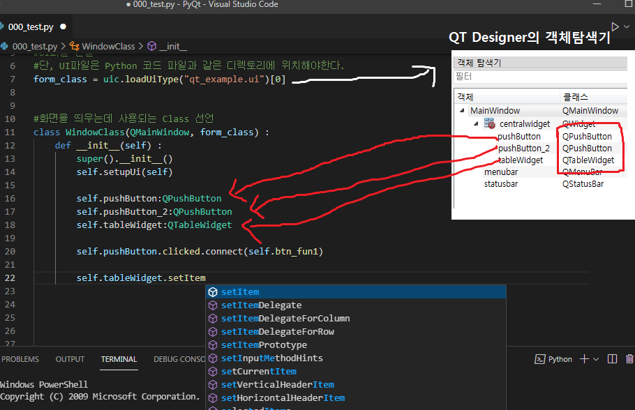 왜냐하면, VSCODE 입장에서는 self.tableWidget이라는 객체의 클래스가 QTableWidget이라는 정보를 모르기 때문이다.