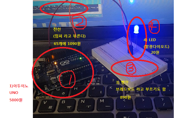 2) 아두이노와 LED를 연결하기 위해서 전선,빵판,LED를 사야한다