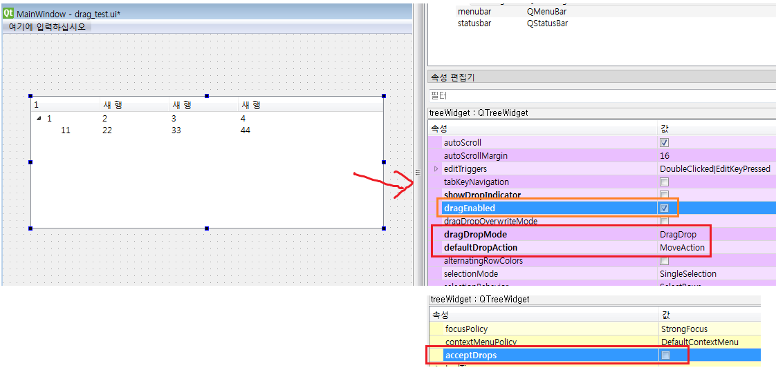 TreeWidget을 예로들면, 트리 안에 들어있는 내용이 원래는 마우스로 드래그가 안됐는데