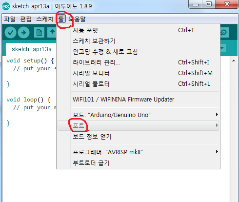 아두이노를 정상적으로 연결했다면, 이제 아두이노 SW가 아래와 같이 달라진다.