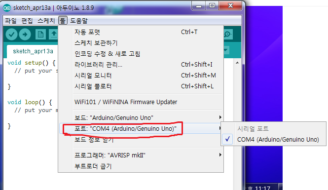 아까는 포트라고 하는 부분이 회색으로 비활성화되어있었는데, 이제는 COM4 라고 적혀있다.