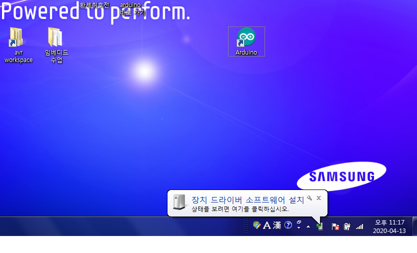 USB 포트를 이용해서 아두이노를 컴퓨터에 연결하면, 바탕화면 오른쪽 하단에 드라이버 설치 어쩌구 메세지가 뜰 것이다.