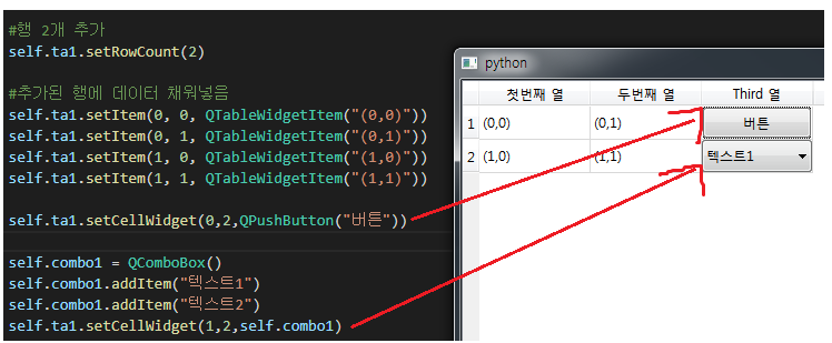 우리는 setCellWidget 메소드를 사용해서