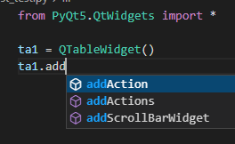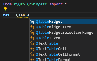QTable 까지만 입력했는데 아래 그림처럼 이미 자동완성으로 비슷한 이름의 클래스들을 나열해준다.