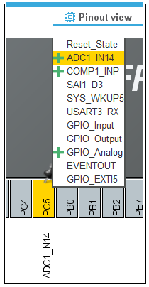 아래 그림처럼 cubeMx에서 PC5번 핀의 용도를 ADC1_IN14로 지정해주자.