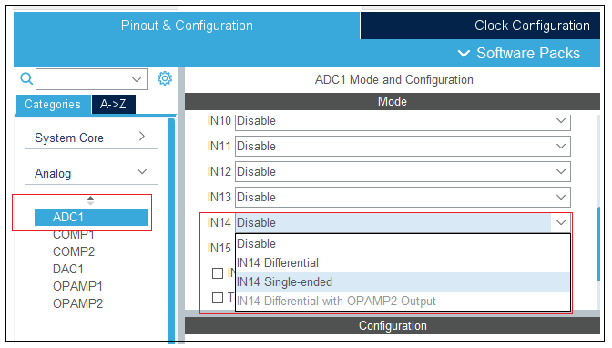 아래 그림처럼 ADC1 모듈의 채널14에 대해서 설정을 해주자. 일단은 single-ended로 고른다.