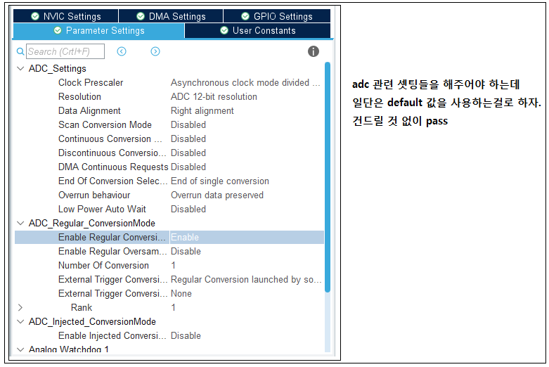 일단 우리는 인터럽트 , DMA 타입을 셋팅안했기 때문에 polling 방식으로 adc 측정을 해볼 것이다.