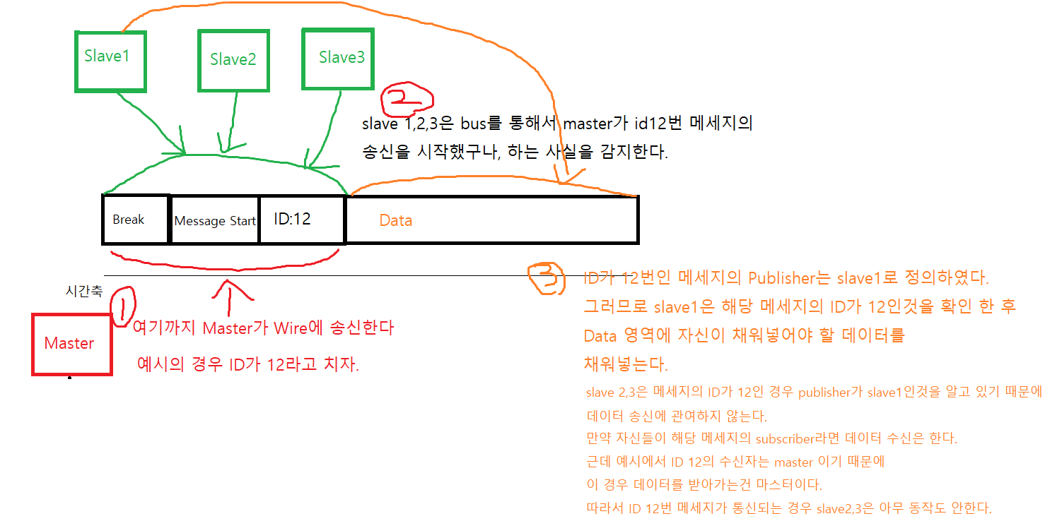 메세지의 시작은 오직 Master가 하는 것이고, 해당 메세지의 Publisher는 LIN 통신의 통신상태를 쭉 확인하다가