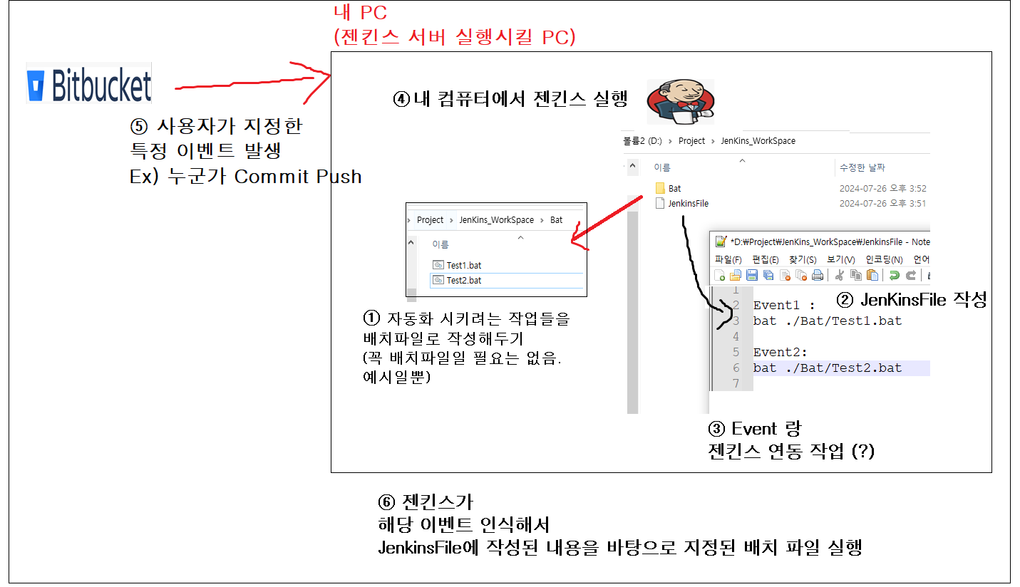 예를 들어 3번 이벤트가 발생하면, 젠킨스가 설치된 컴퓨터에 설치된 TestBat.bat 배치파일을 실행한다.