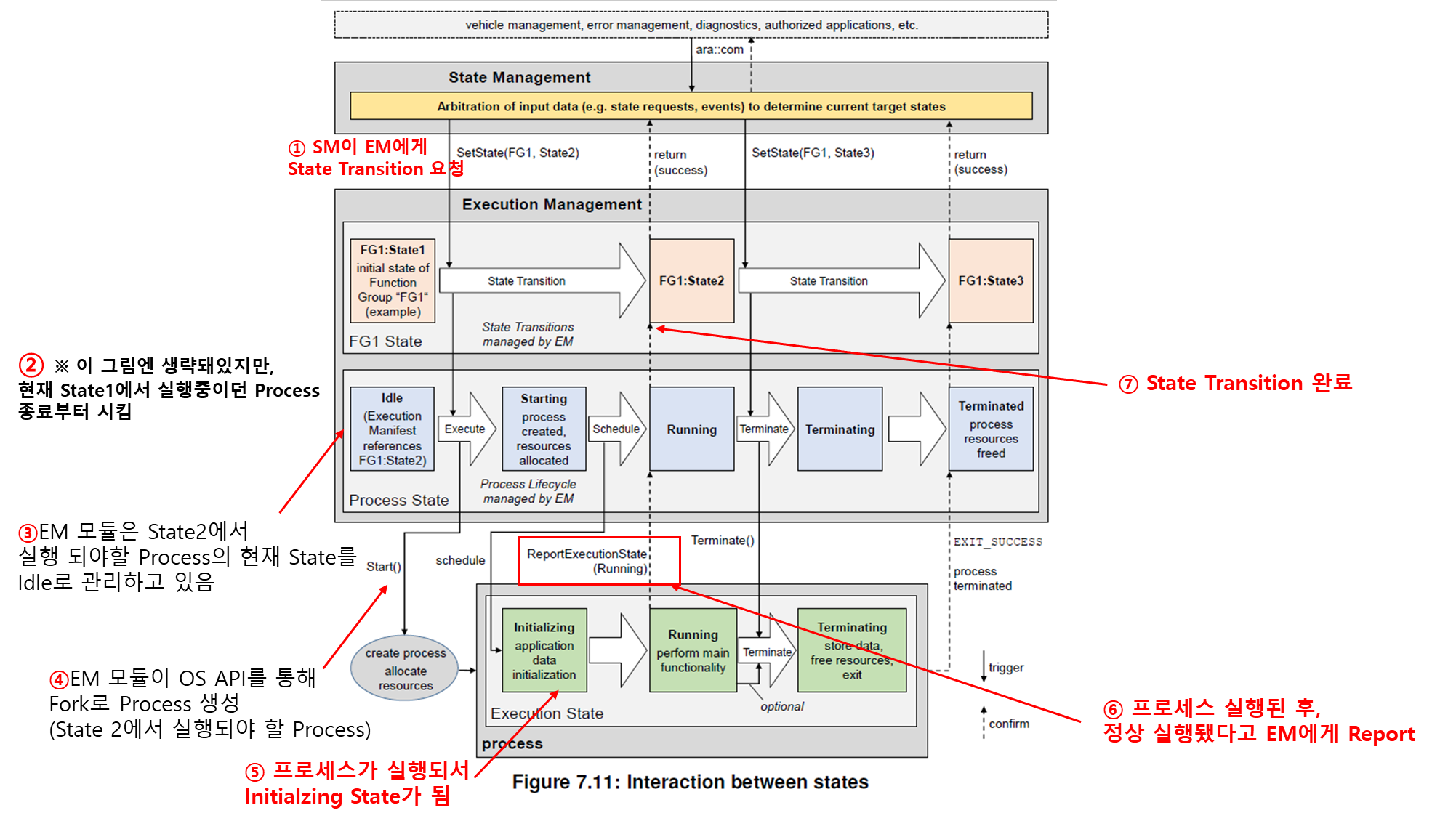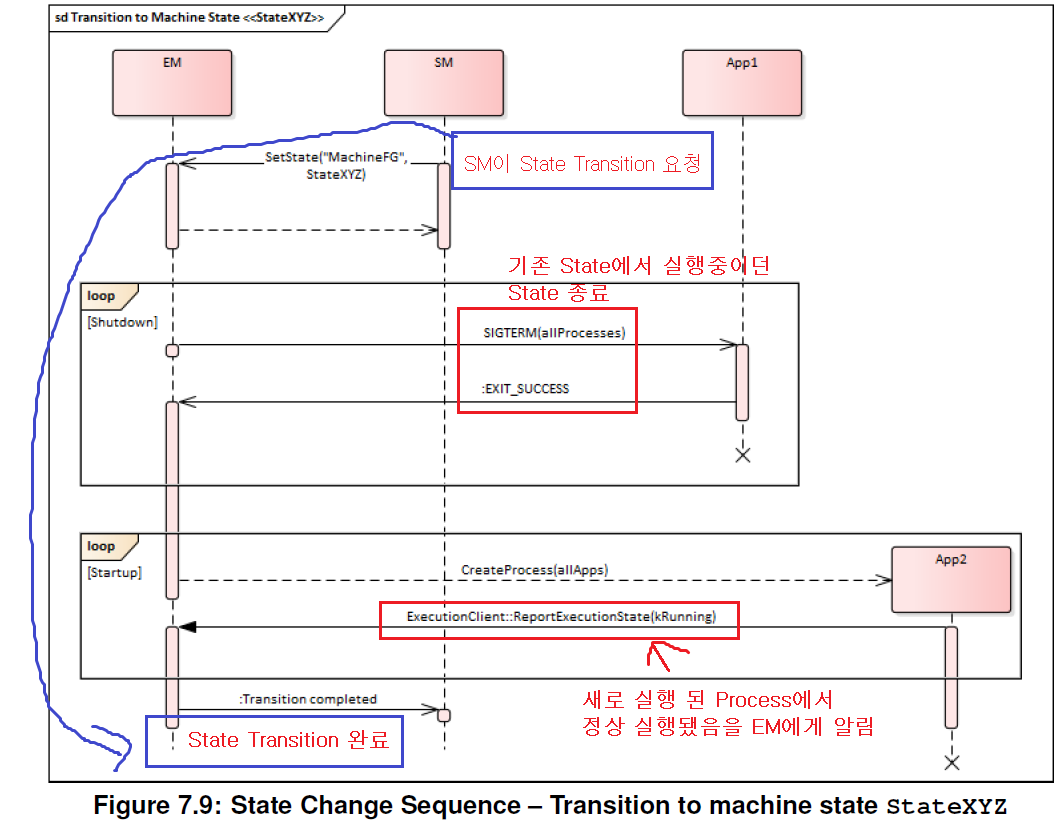 State Management(SM)이라는 SW가 별개로 있고, 조건에 따라 Transition 변경 요청은 SM이 EM에게 날리는 식이다.