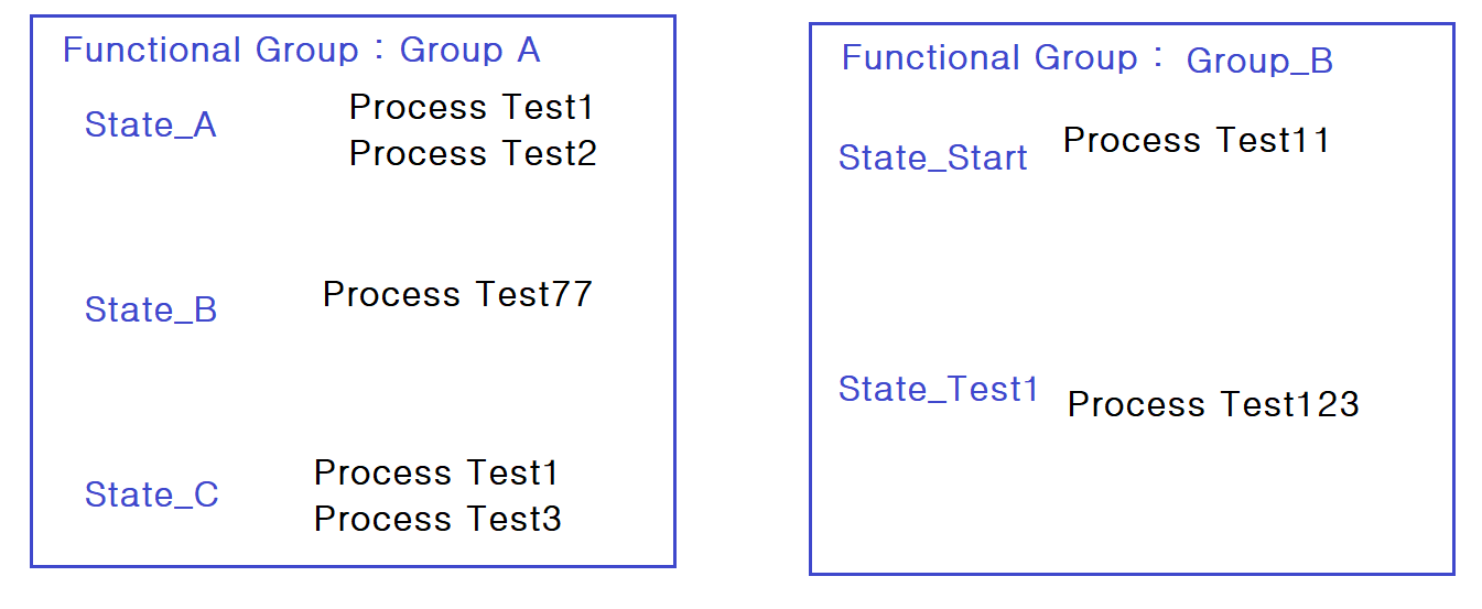 Group A라는 Functional Group의 State가 "State_B"가 되면 기존의 State_A에서 실행중이던 Process Test1,Test2를 종료하고 State_B에 매핑되어있는 Test77 Process가 실행된다.