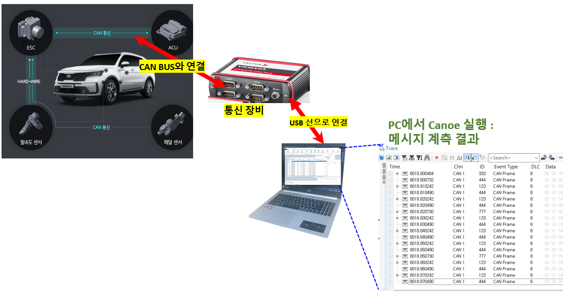 통신 장비는 캔 네트워크에서 송수신되는 메세지를 계측하여, 관련 정보를 USB를 통하여 PC에게 전달해주고.