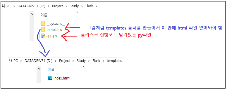 templates 라는 폴더를 만든 후, 이 폴더안에 html 파일을 넣어놔야 정상 실행된다.